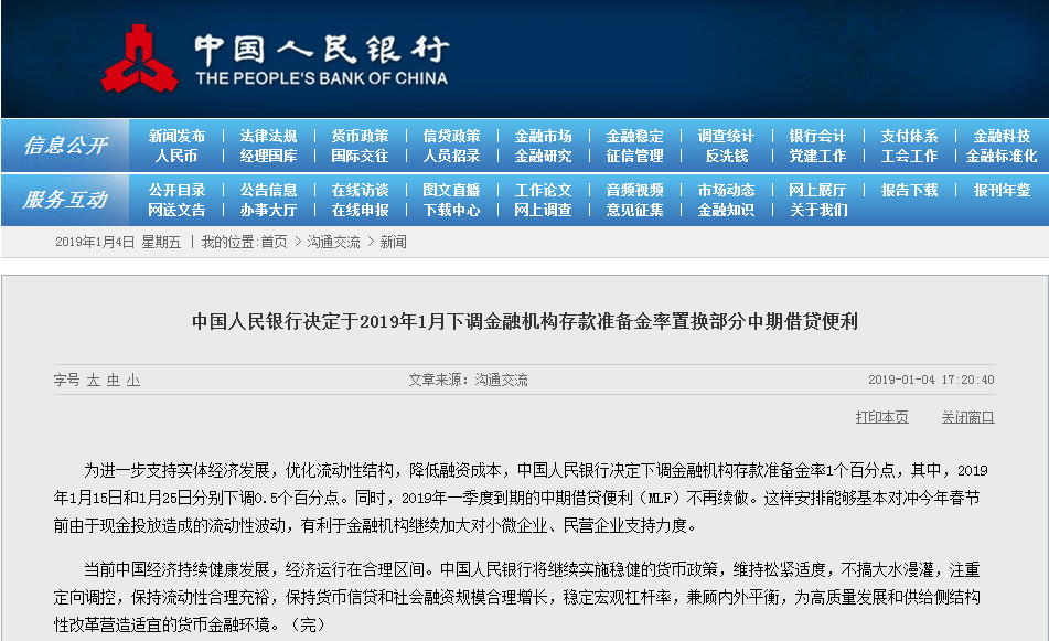 为进一步支持实体经济发展,优化流动性结构,降低融资成本,中国人民银行决定下调金融机构存款准备金率1个百分点,其中,2019年1月15日和1月25日分别下调0.5个百分点。同时,2019年一季度到期的中期借贷便利(MLF)不再续做。这样安排能够基本对冲今年春节前由于现金投放造成的流动性波动,有利于金融机构继续加大对小微企业、民营企业支持力度。
